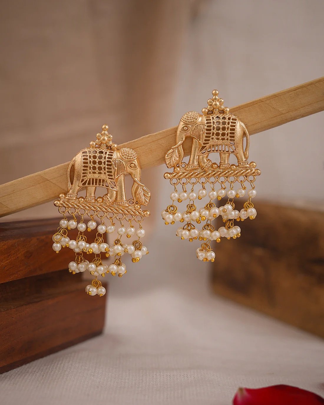 Gajraj Premium Gold Danglers feature a golden elephant motif with white pearls, blending tradition and elegance. Lightweight and versatile, they add luxurious charm and sophistication to festive or everyday ethnic outfits.