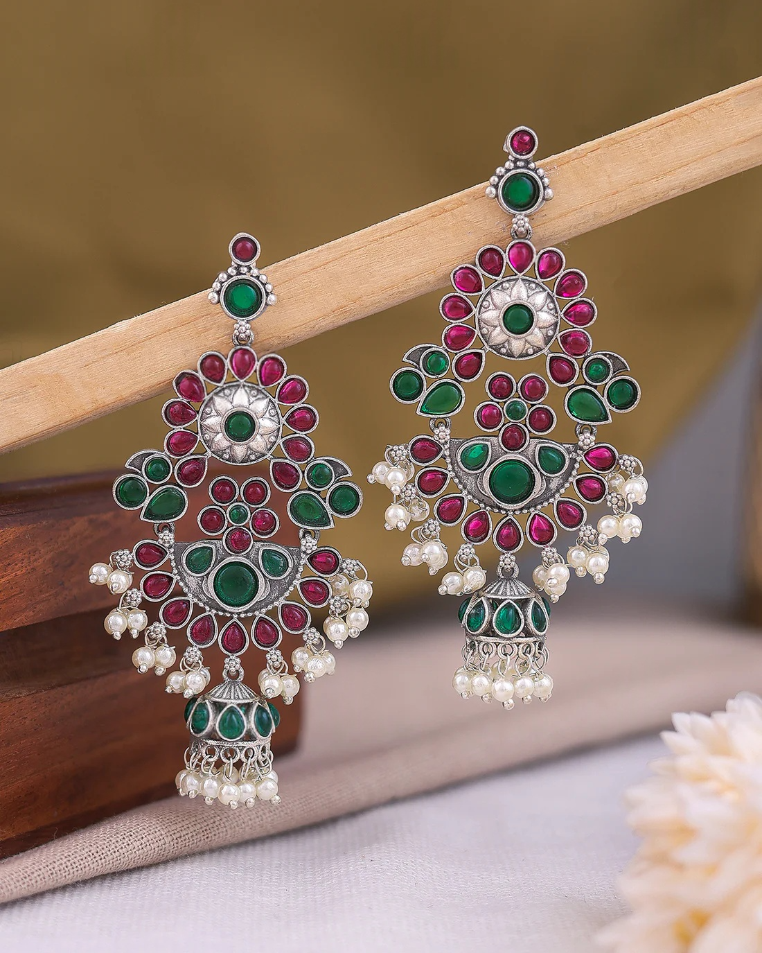 & Free ShippingPrerna Dangler Earrings feature oxidized silver, vibrant stones, and delicate pearls. Handcrafted with care, they add elegant charm and a colorful touch to elevate any festive or traditional outfit.