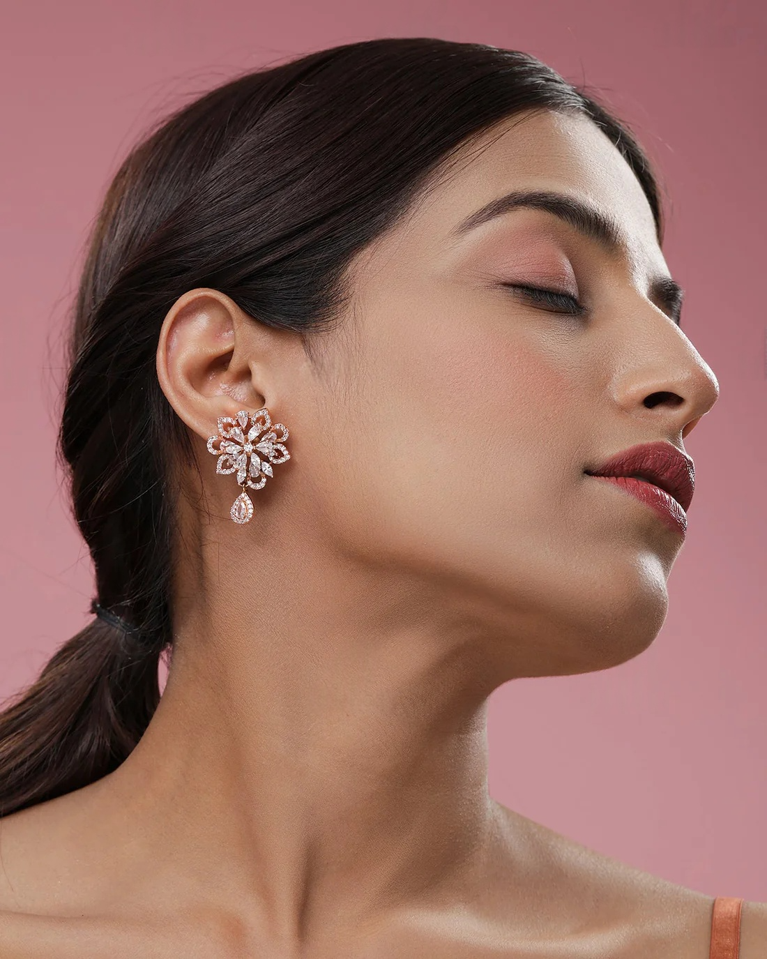 Make a bold yet elegant statement with the Stacy Rose Gold Small CZ Dangle Earrings. Designed with a chic bell-shaped charm, these earrings blend contemporary style with timeless sophistication. The rose gold finish adds a warm, luxurious touch, while the sparkling CZ stones offer just the right amount of shine for any occasion. Lightweight and expertly crafted, they provide comfort without compromising on style. Perfect for those who love to stand out, these earrings elevate both casual and dressy looks. Dare to be different and embrace your unique style with this must-have accessory in your jewelry collection.