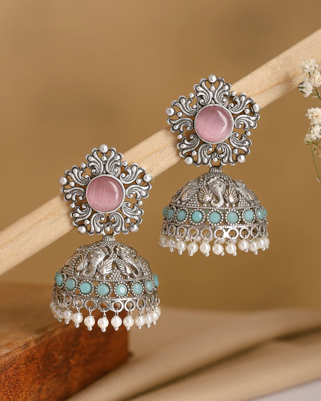 Ditya Jhumki Earrings feature colorful stones and delicate pearls, blending elegance with traditional charm. Lightweight and versatile, they add sophistication and a festive touch to both ethnic and contemporary outfits.