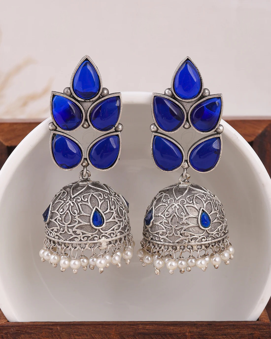 Isabella Drop Jhumka Earrings from Dejwel are a perfect blend of elegance and statement style. Each piece of Dejwel jewelry tells its own unique story, reflected in the intricate detailing and craftsmanship of these earrings. Designed to complement your personality, they add a finishing touch that enhances your overall appearance. Crafted in oxidized silver, Isabella Drop Jhumkas are ideal for those who love bold, standout styles, making them perfect for festive occasions, parties, or special events. Lightweight yet striking, they effortlessly transform any outfit, adding charm, sophistication, and a fashionable edge to your jewelry collection.