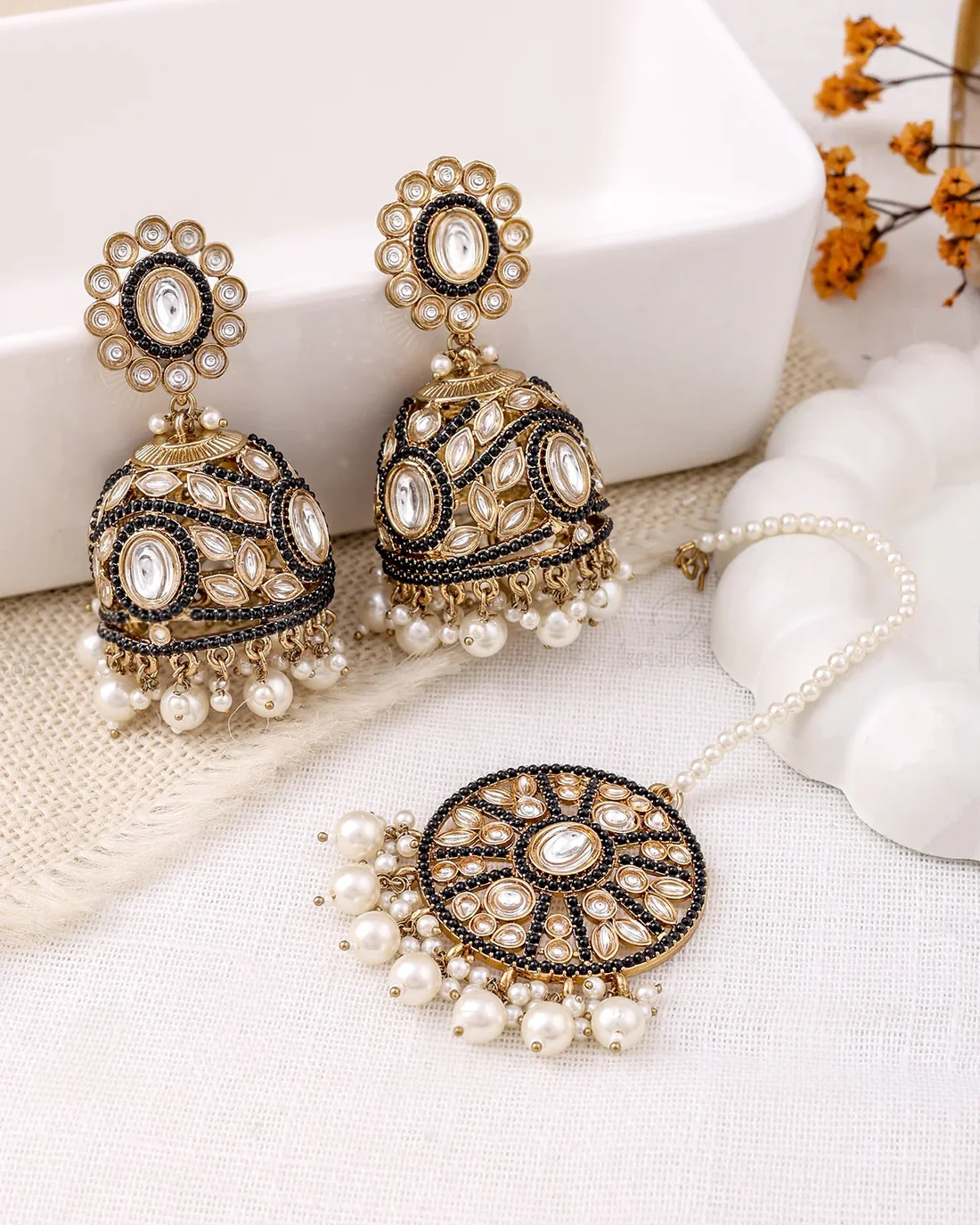 These Jhumkis with Mangtika feature intricate designs and dazzling Kundan stones, blending traditional Pakistani craftsmanship with elegance. Lightweight and striking, they elevate any festive or special occasion outfit effortlessly.