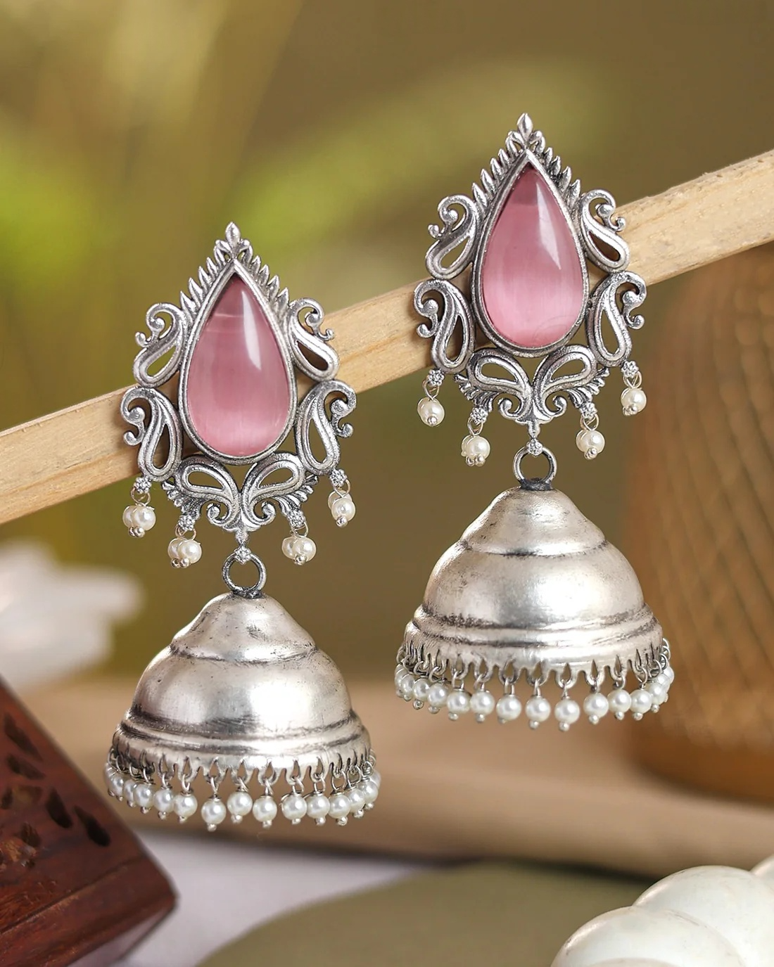 & Free ShippingYuvika Jhumki Earrings in oxidized silver feature colorful stones and white pearls, adding traditional elegance. Perfect for any occasion, they’re a stylish, must-have addition to elevate your ethnic jewelry collection.