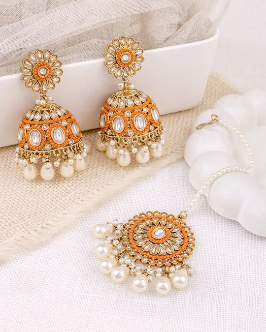 These stunning Jhumkis with Mangtika showcase the timeless beauty of traditional Pakistani jewelry through their intricate designs and exceptional craftsmanship. Adorned with dazzling Kundan stones, they offer a perfect blend of elegance, cultural richness, and refined sophistication. Each piece is thoughtfully crafted to highlight delicate detailing, making it an ideal choice for weddings, festive events, or elevating your everyday ethnic look. The coordinated mangtika adds an extra touch of grace, creating a beautifully balanced ensemble. Lightweight yet striking, these accessories ensure comfort while making a lasting impression. Upgrade your jewelry collection with this exquisite set that radiates charm and heritage.